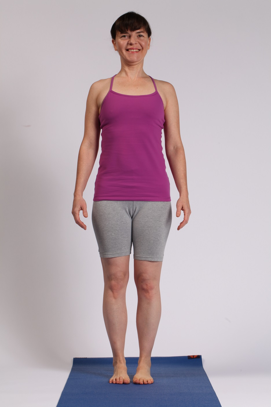 In yoga asanas, you can work with your feet and legs by paying attention to your position in standing postures. Look down at your feet or use a mirror. Notice if the toes of one foot are dripping the mat. Relax them. Feel the soles of your feet connected to the mat. Lift and spread your toes wide and then lower them down. Now notice the feeling of your feet on the mat. Is your weight evenly distributed from right to left? From front to back? Then build your posture from the ground up. ensuring you are firmly grounded before moving. This is sometimes referred to as “root to rise”.