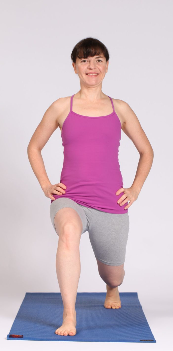 This cue to “square your hips or “hips like headlights” for some standing poses has been around a long time. Unfortunately, it only applies in certain postures and not to all bodies. Bones are differently shaped and this affects each person’s range of movement. Squaring your hips at the wrong time can strain the joints, typically the knee. So, how can you protect yourself and still practice these poses? Let’s start with Warrior A, or Virabhadrasana A, one of the main poses where this cue is used. In Warrior A, the standing lunge pose, however far outwards the back foot is pointed, it is important to line up the ankle, knee and outer hip in a straight line from that angle. No twisting the hip forward to “square it”. The comfortable or appropriate amount to turn one’s foot out varies from person to person. The rib cage may twist slightly forward in order to face forward. Since many people have tight hips, I usually start with a symmetrical lunge position and turn the back foot all the way forward, bending the back knee and lifting the heel. See the photos above. This is a place where squared hips can work as both legs are pointing straight ahead. Pressing back through the heel and lowering it down can be a gentle version of the pose and still both legs and feet are pointing straight ahead. This may be the end pose for you. Be happy! Adapt the poses to fit your body, don’t make your body fit the poses. This is advanced yoga. To sum up: square the hips in lunges where the back leg and foot are pointing directly forward but not in Warrior A where the back foot is pointing towards the corner or long edge of the mat.